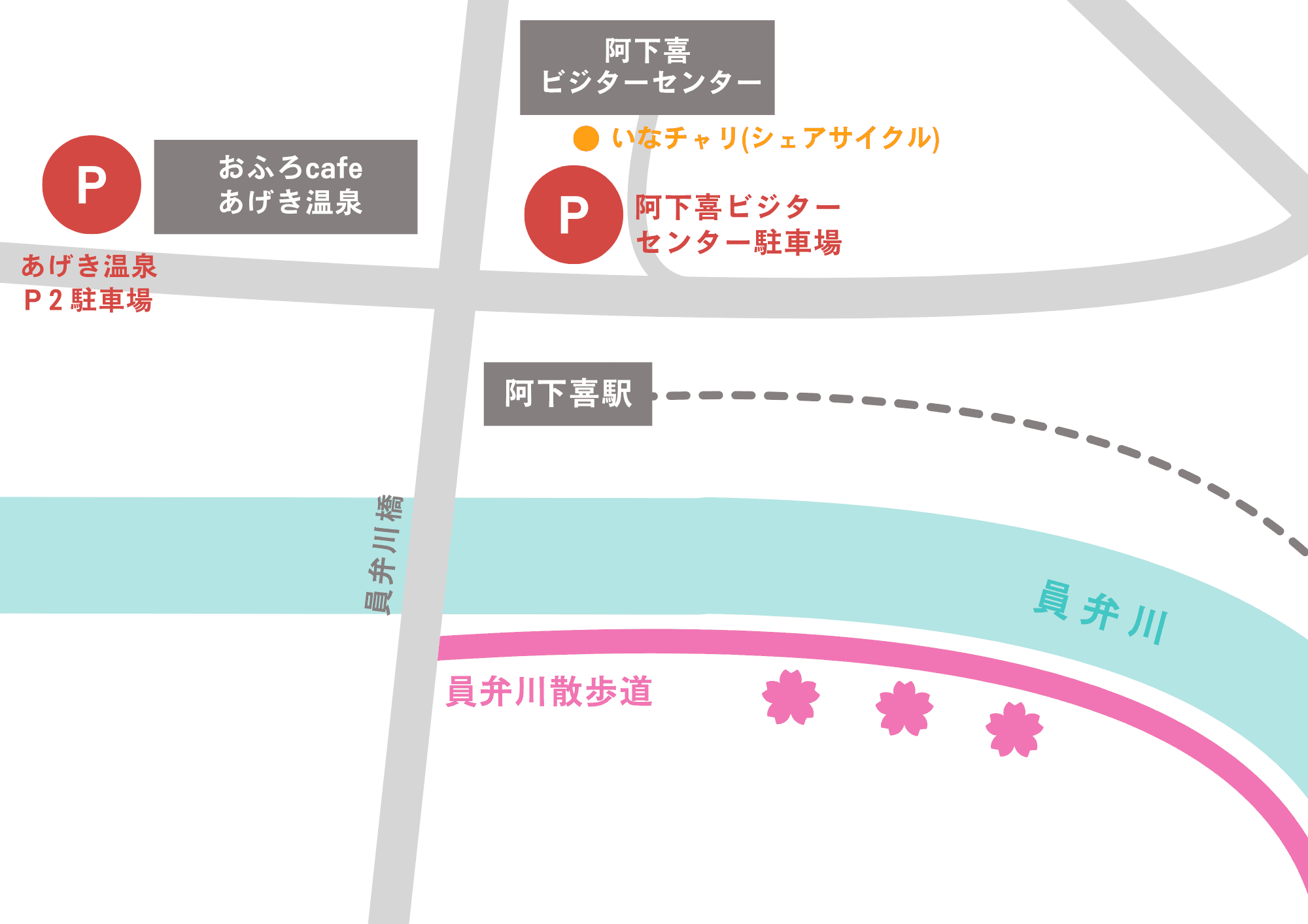 (あげき温泉施設正面はP1駐車場。利用者優先となりますので、施設西側のP2駐車場への駐車にご協力をお願いいたします。)