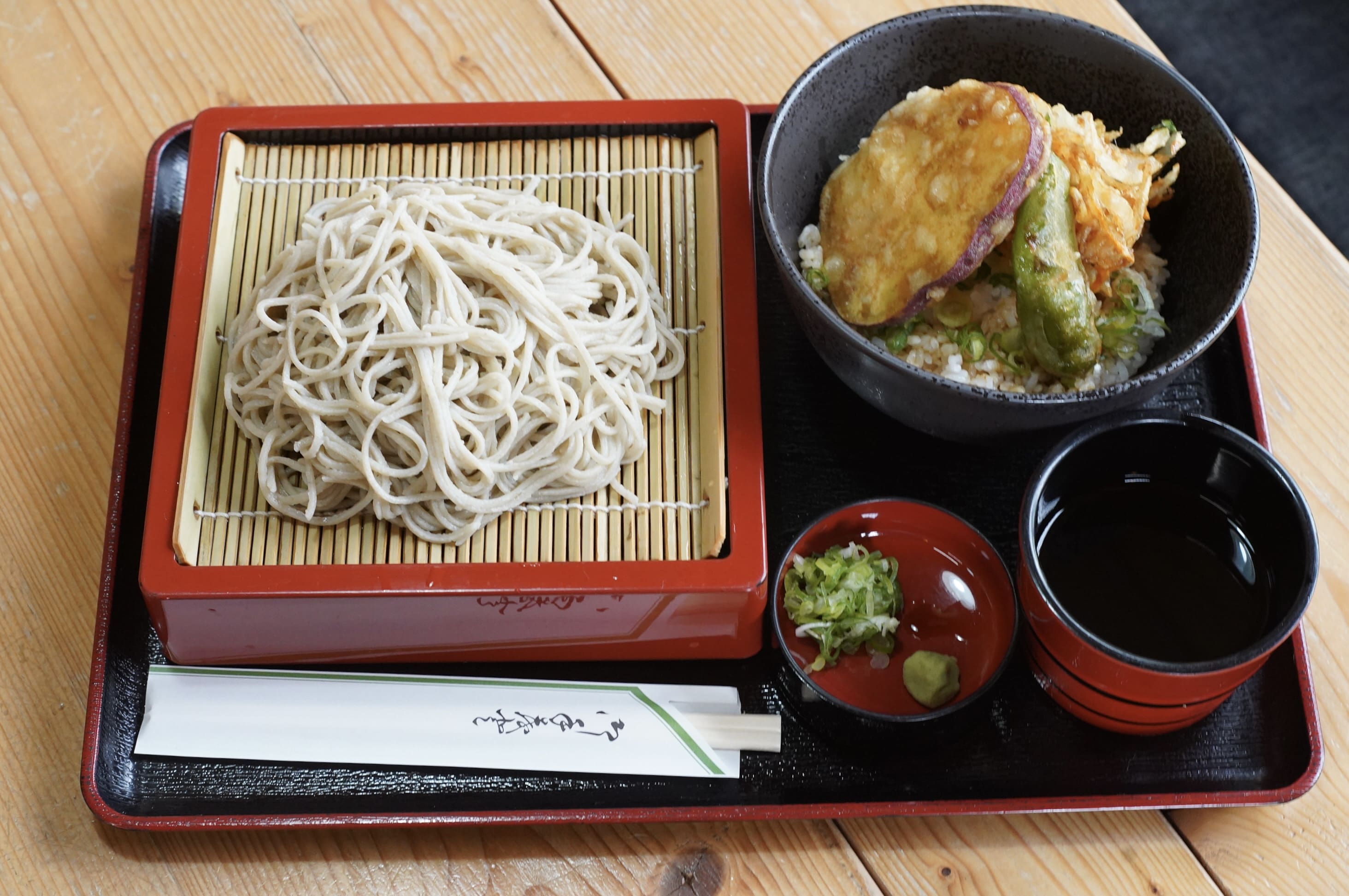 しっかりとお腹いっぱい食べたい人にはボリュームたっぷりの天丼・ざるそばセットがおすすめ。午前中に目一杯動いてお腹を空かせて思い切り食べたい。