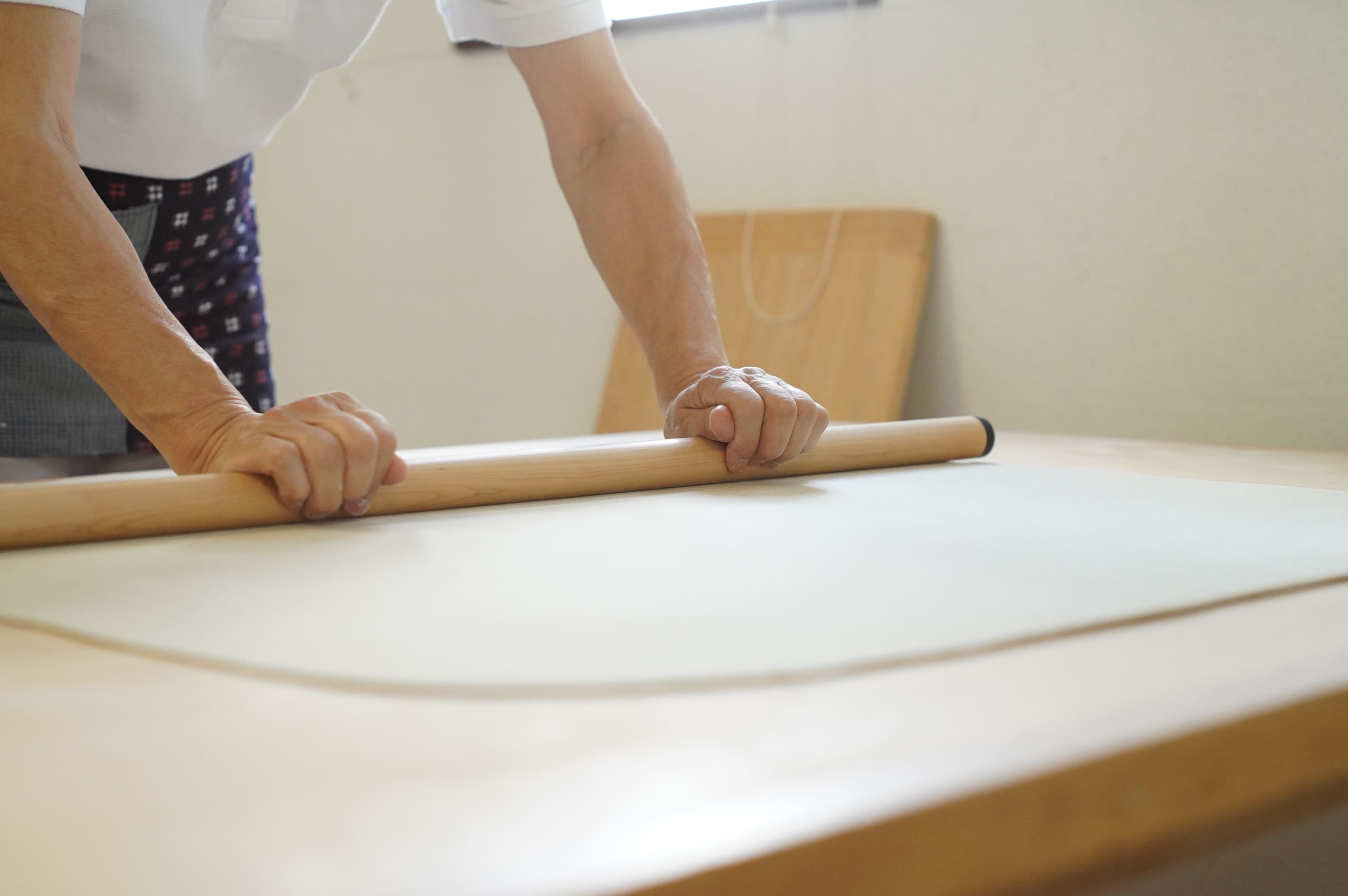 その後、のし棒で丸く延し、それから真四角へと形を変えていきます。