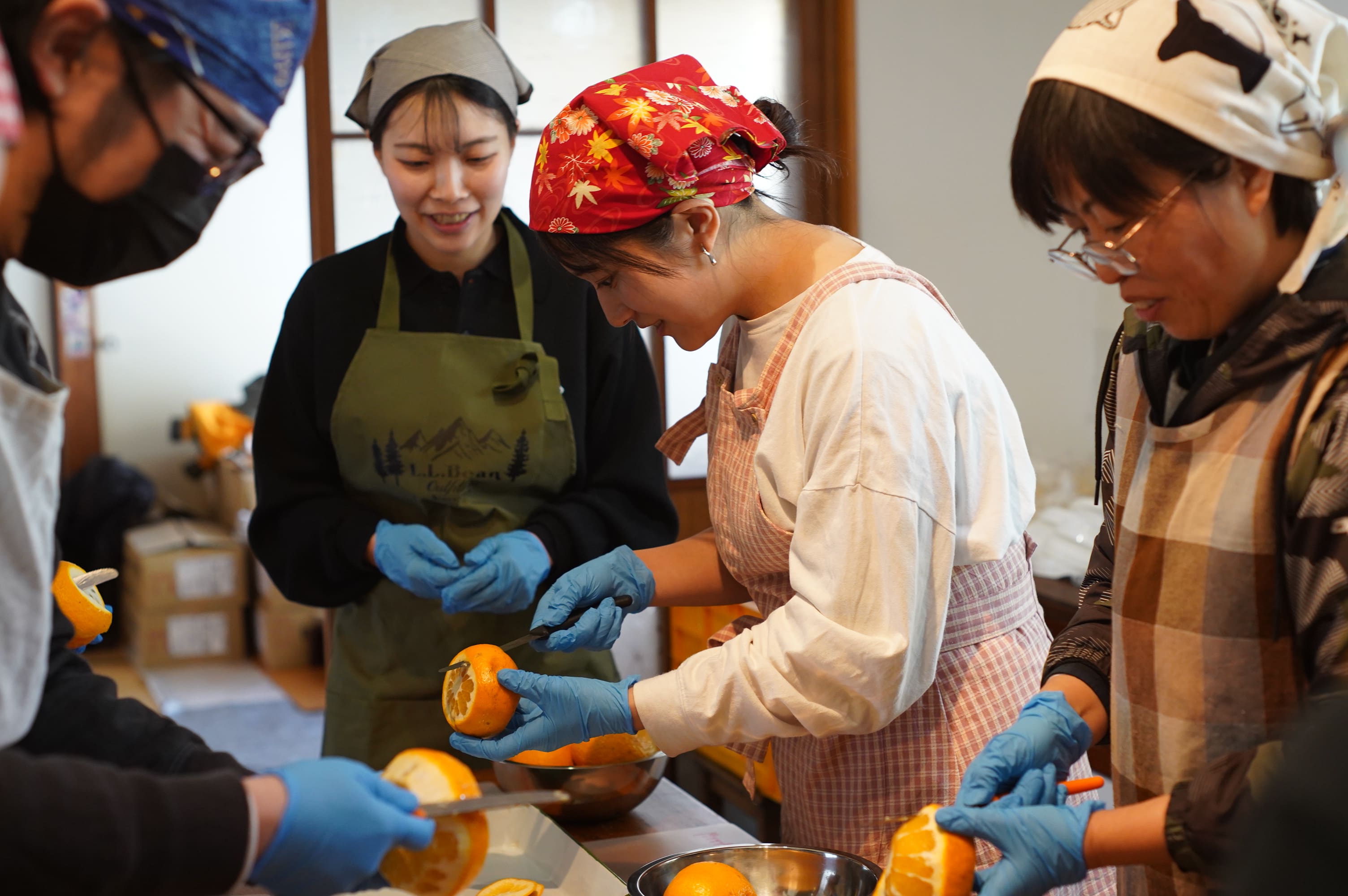 - エプロンor割烹着、三角巾、スリッパ、手拭き用のタオル